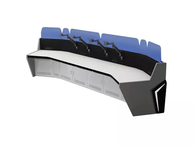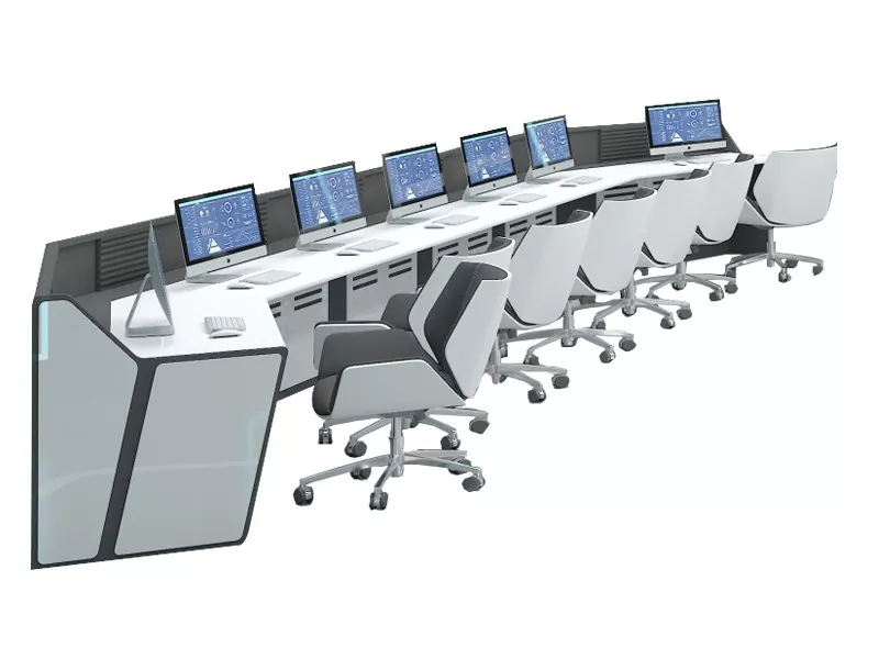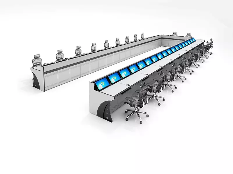 मल्टी-सीट मॉनिटरिंग कंसोल एक एकीकृत वर्कस्टेशन सिस्टम है जो एक साथ काम करने वाले दो या दो से अधिक ऑपरेटरों को समायोजित करता है। यह मॉनिटर लगाने, नियंत्रण उपकरण होस्ट करने, केबल प्रबंधित करने और विस्तारित शिफ्ट के दौरान एर्गोनोमिक आराम बनाए रखने के लिए एक केंद्रीकृत मंच प्रदान करता है।